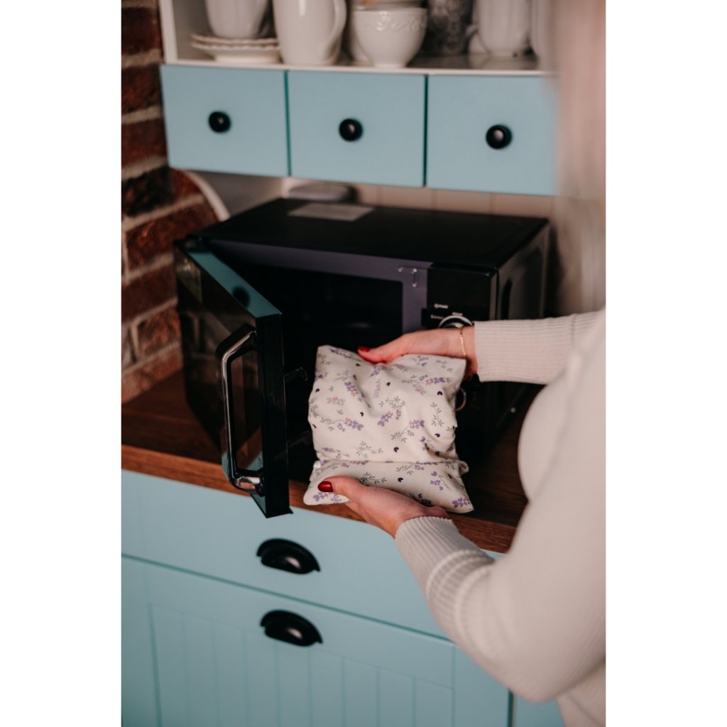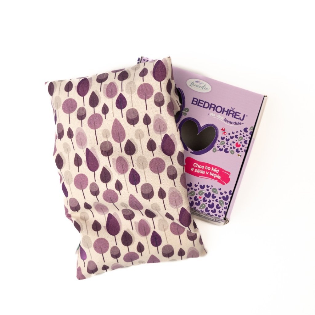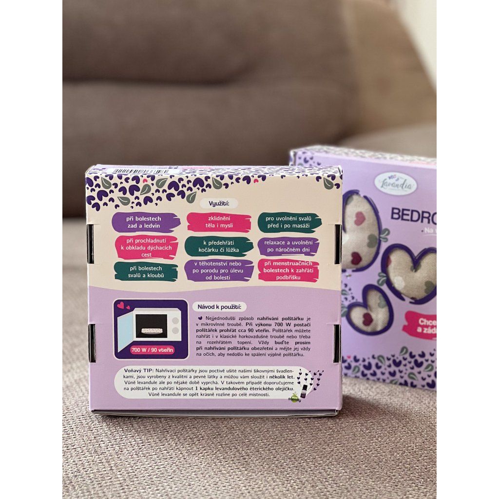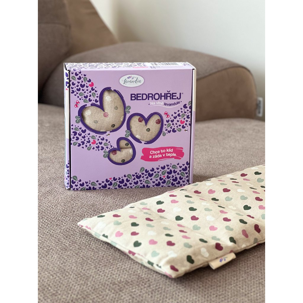 Hrejivý bedrový vankúš 40 x 20 cm so snímateľným a prateľným poťahom, plnený pšenicou a kvetom organickej levandule. Zabalený v celofánovom obale s návodom na použitie, vložený do darčekovej krabičky.