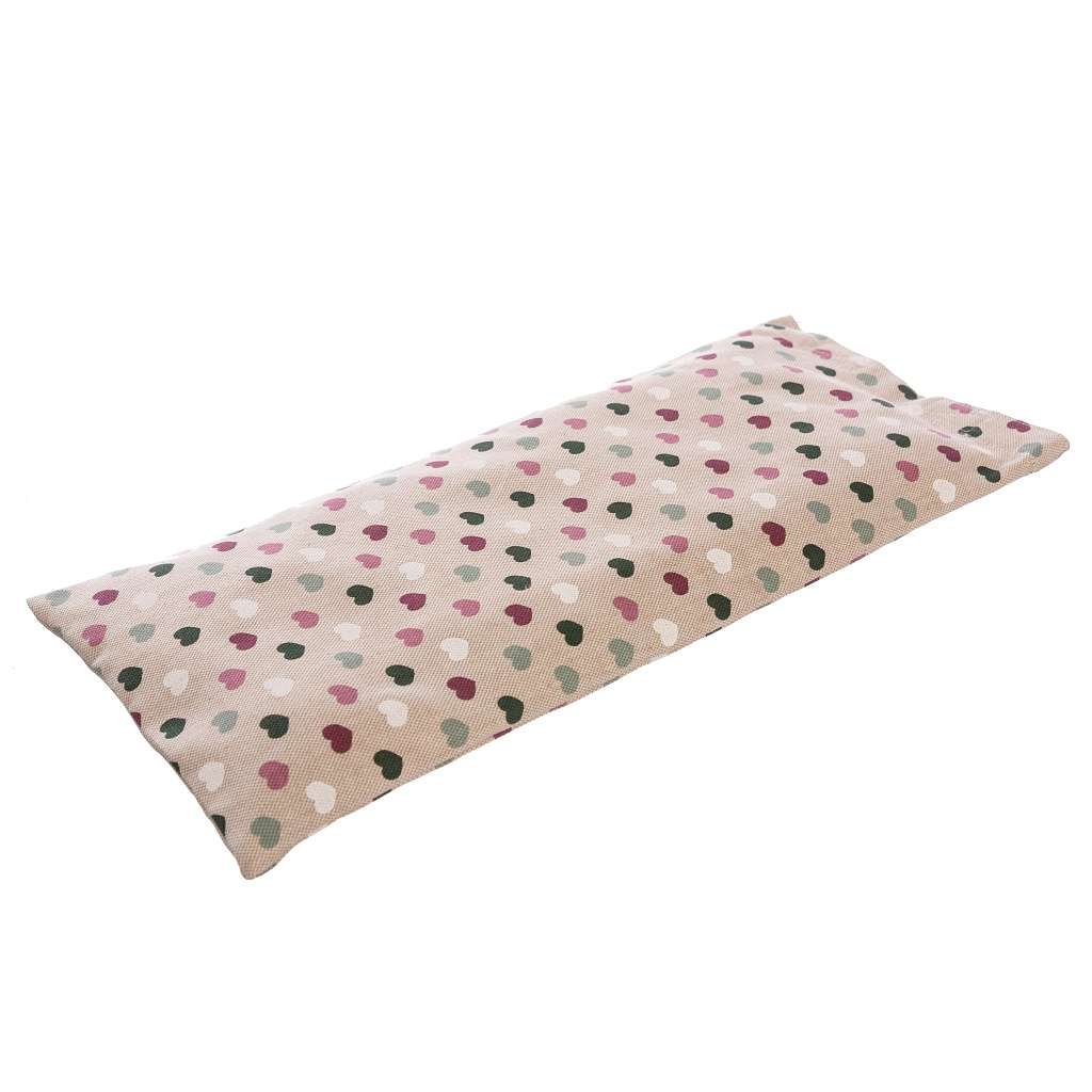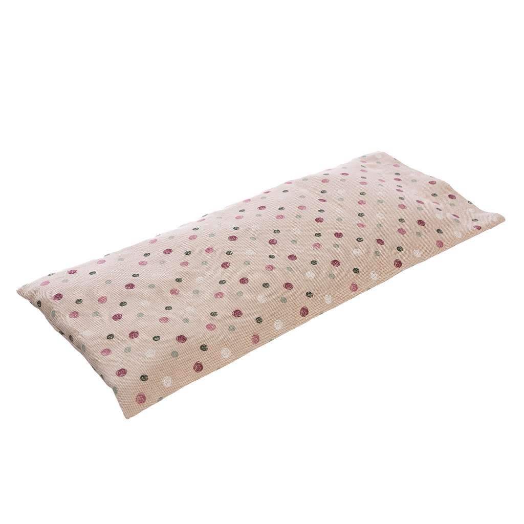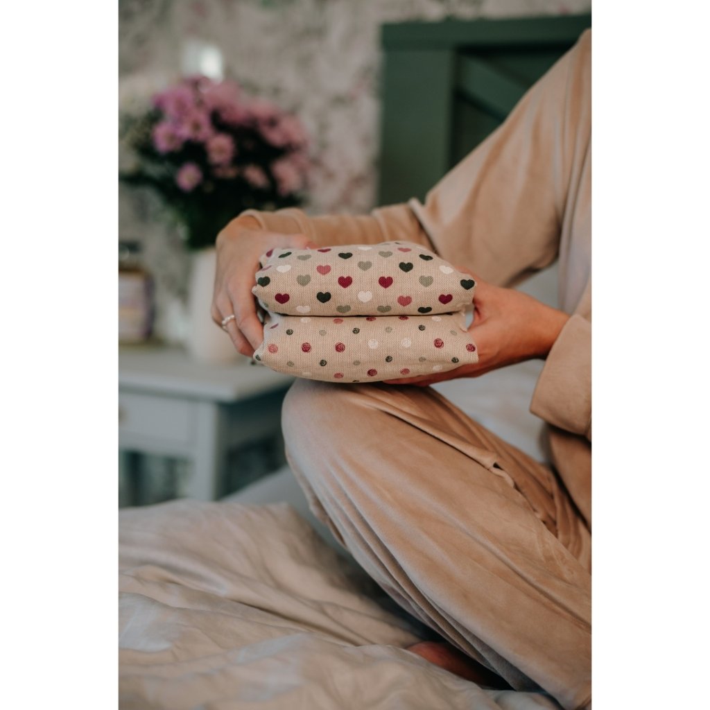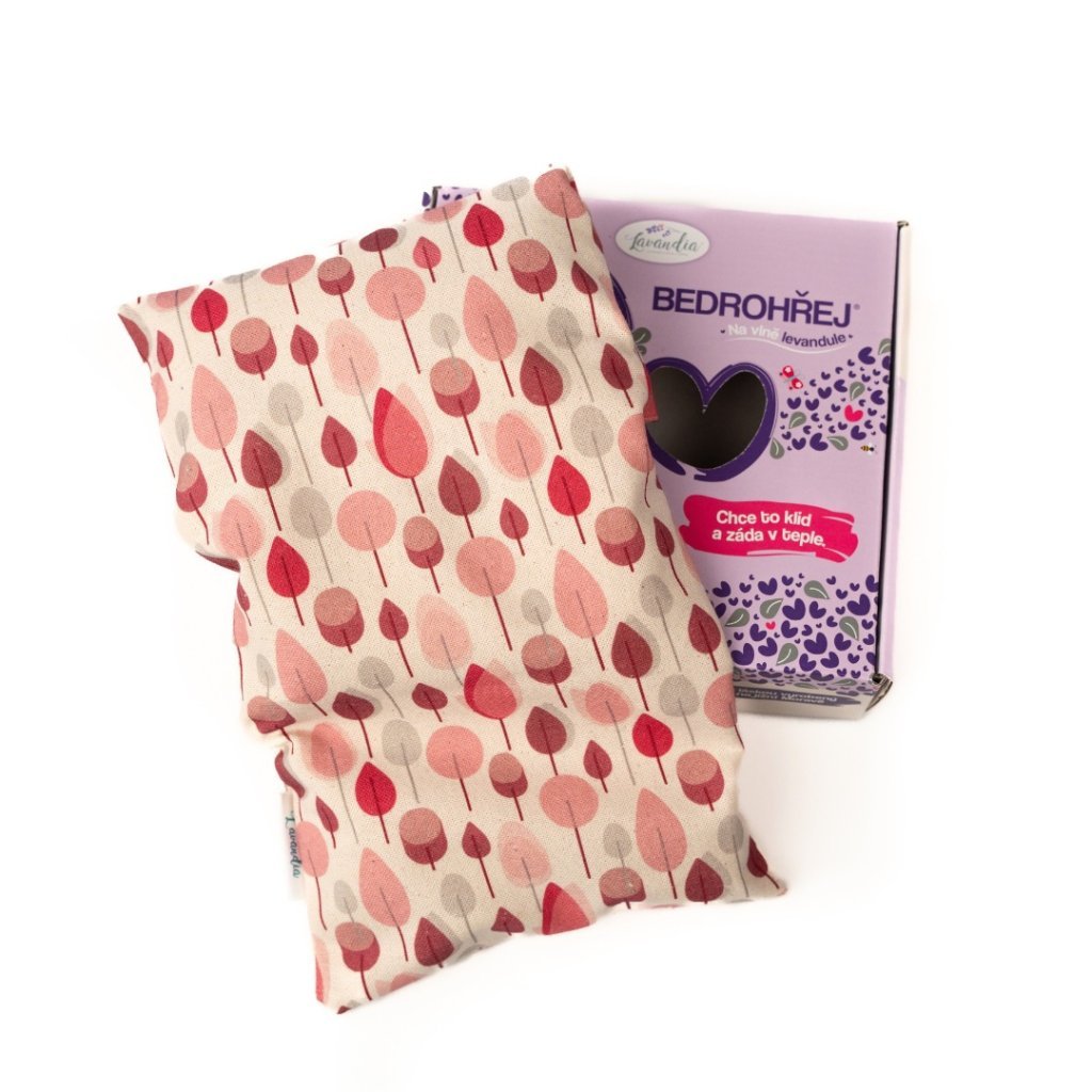Hrejivý bedrový vankúš 40 x 20 cm so snímateľným a prateľným poťahom, plnený pšenicou a kvetom organickej levandule. Zabalený v celofánovom obale s návodom na použitie, vložený do darčekovej krabičky.