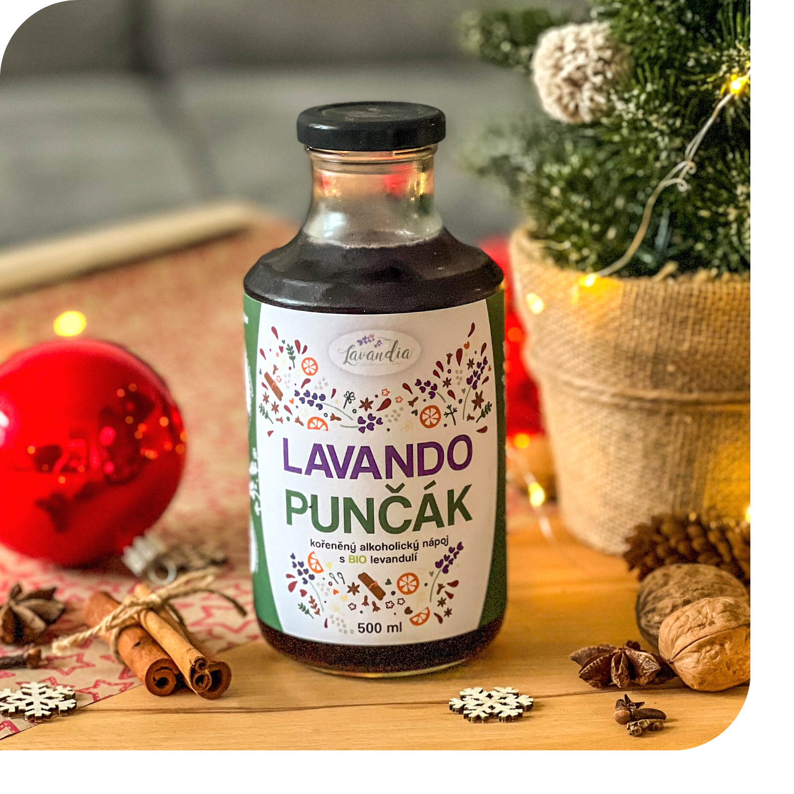 Sladký vianočný punč vyrobený v spolupráci s Vinárstvom na Blatech z neďalekého Drnholca. Dokonale ochutený a prevoňaný škoricou, klinčekmi a pomarančom. Sýtočervenú farbu vykúzlil kvet ibišteka, chuť lahodne obohatili šípky. Samozrejme, nemohla chýbať ani levanduľa. Jemnú bylinkovú chuť cítiť v každom dúšku. Všetko v bio kvalite.