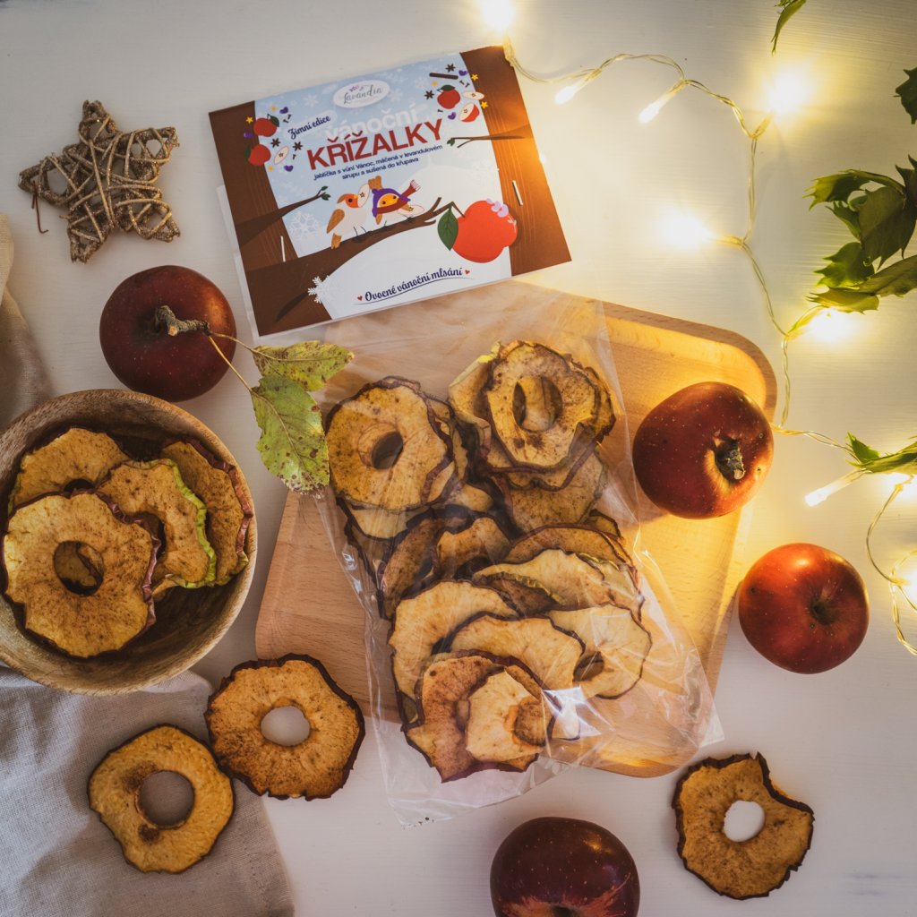 Naše Vianočné krížalky sú poctivo sušené červené jabĺčka Jonagold z nášho ovocného sadu na južnej Morave, máčané v levanduľovom sirupe a usušené do chrumkava. Žiadny cukor, žiadne konzervanty - len čistá chuť domova, kvapka levanduľového kúzla a chuť, ktorá pripomína zimné popoludnie na Morave. 💜